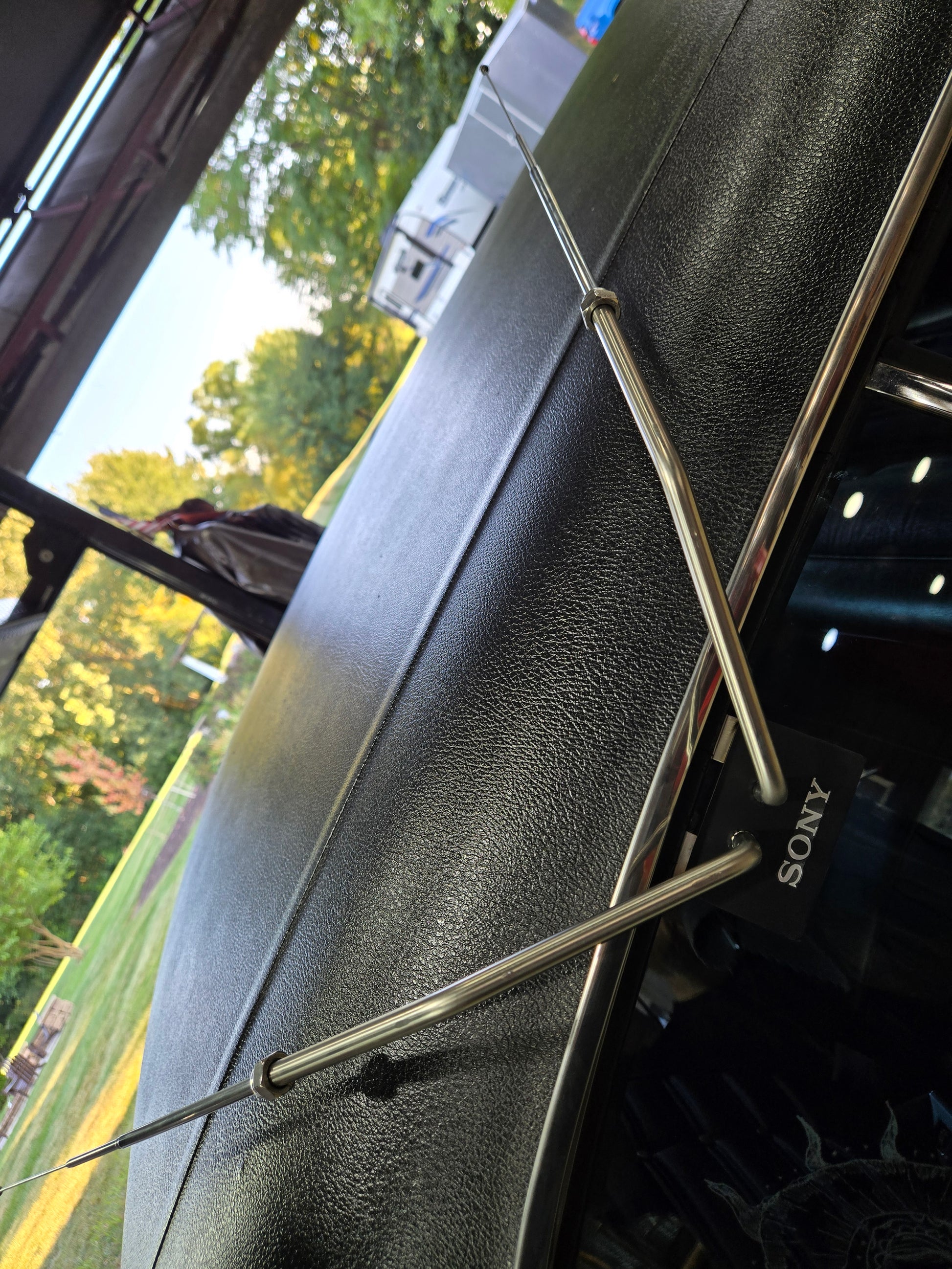 This is a copy/reproduction of the super groovy sony rabbit TV antenna from the 70s. This style clips to the window. Made from stainless steel.